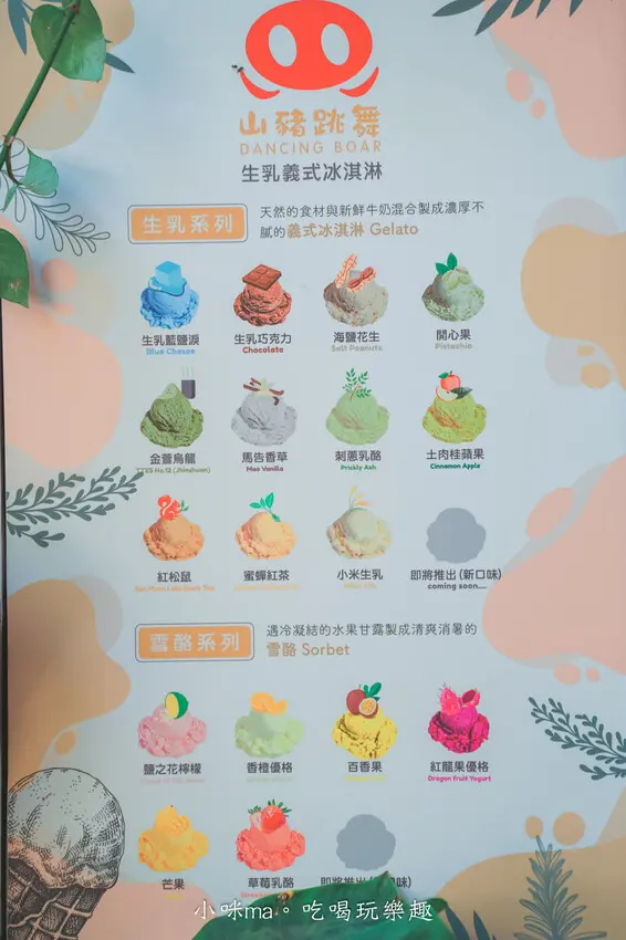 滿滿的手工冰淇淋有分生乳冰淇淋跟水果雪酪系列,運用台灣原生香料、植物、水果製成,還可以看到刺蔥、馬告、小米的口味喔,總共超過10種的風味任君挑選