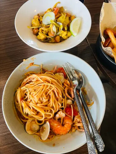 西班牙海鮮燉飯以及義式蕃茄海鮮麵。海鮮都給得很足夠,而且都很新鮮非常鮮甜