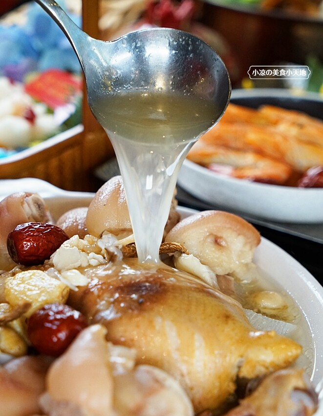 小涼最愛沒有過多調味的雞湯囉!完全藉由豬腳、全雞、當歸、蒜頭、紅棗等配料來熬煮,豬腳的滿滿膠質也入湯內,讓湯頭喝起來濃香溫潤又順口,喝上一碗你就會想要在趕快舀上第二碗呢
