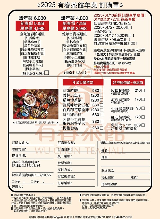 勸募期間: 2024/12/25~2025/1/15,可直接與有春茶館聯繫或線上填單結帳,即可完成暖心年菜認購流程。