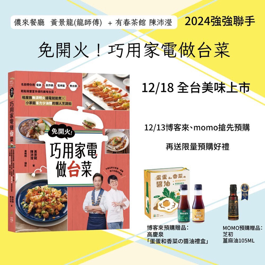 2024年末最夯的就是這一本由有春茶館闆娘陳沛瀅與知名料理達人黃景龍師傅共同出版的《免開火!巧用家電做台菜》食譜,教你如何在家免開火就能做出噴香的台菜,目前已經在許多網路平台販售,有興趣的朋友可以點以下網址參考購買唷!
