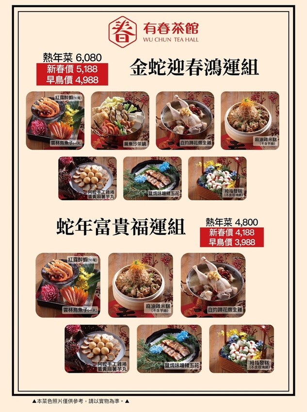 有春茶館2025年菜外帶“金蛇迎春鴻運組“開打囉!現在只要提早預訂更享早鳥優惠價格、113/12/31日前預訂再加贈由黃景龍師傅與陳沛瀅創辦人出版的《免開火!巧用家電做臺菜》食譜。