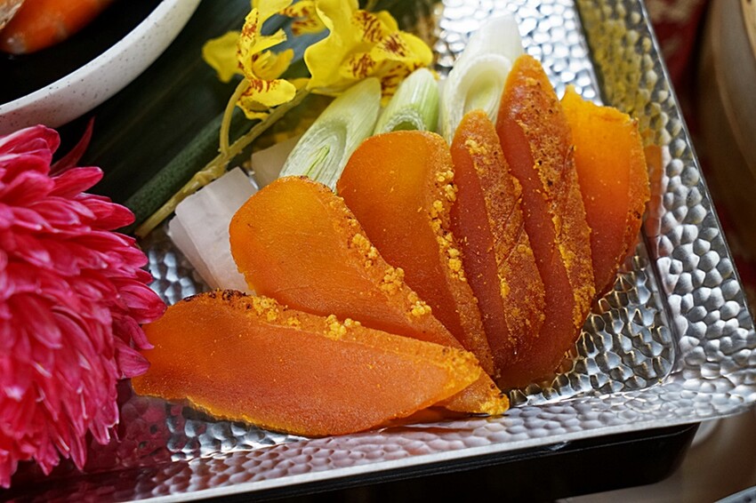烏魚子底部有放蒜苗以及蘿蔔片,可以單吃或是加上蒜苗一起吃都很ok!烏魚子內軟綿密,口口香醇,且油脂及水分依舊保留住,這來自雲林在地的烏魚子更能呈現道地的鮮味!