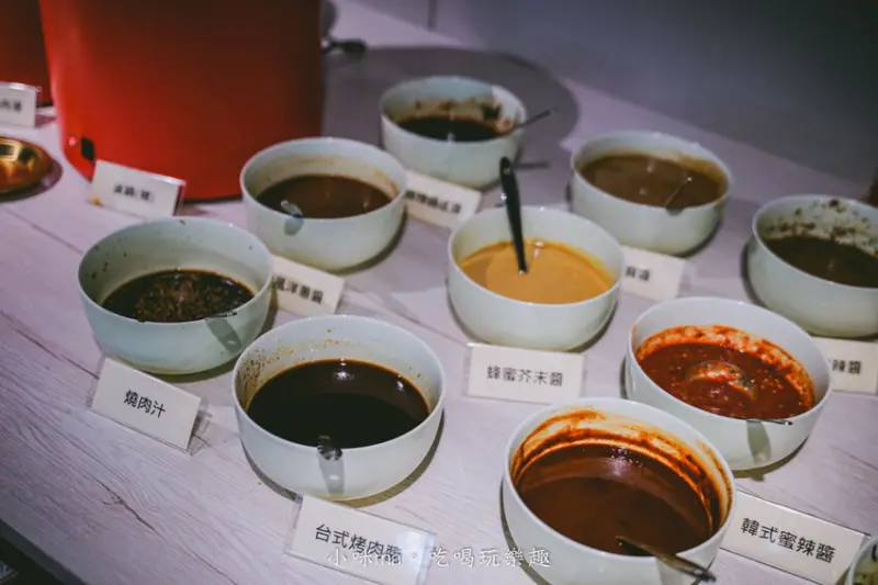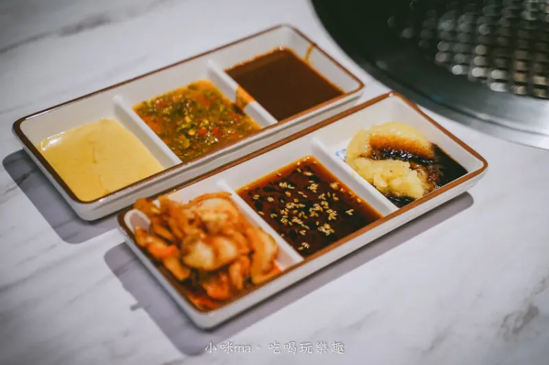 醬料部分也是下足了工夫,除了常見燒肉汁、烤肉醬、蔥鹽之外,還有好多種風味的醬料,我最推的是泰式辣醬跟韓式辣醬,配肉超搭的