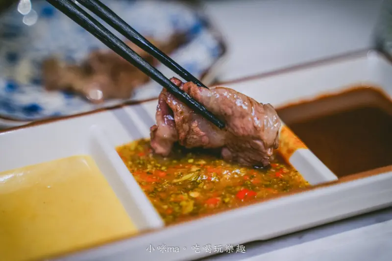 翼板牛帶有豐富的油花,吃起來軟嫩多汁,沾點泰式,酸辣口感更加開胃