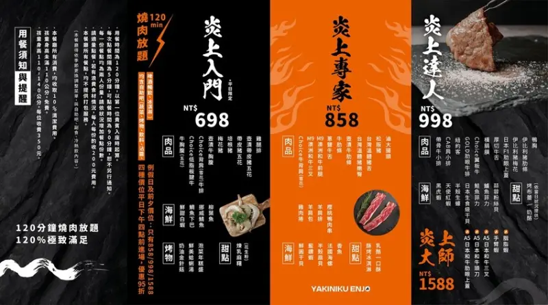 炎上燒肉一共分四種價位,698元、858元、998元、1588元,價格越高能吃到的肉品品項越多,最低的698元吃到飽是平日限定,我覺得698元的菜單就可以爽吃,全部包含甜點、蔬菜、烤物、飲料、冰淇淋自助吧吃到飽,每一種價位都包含生啤無限喝,當月壽星也有優惠,兩人同行(含)以上整桌9折!平日下午四點前來店消費,還有95折優惠唷!
