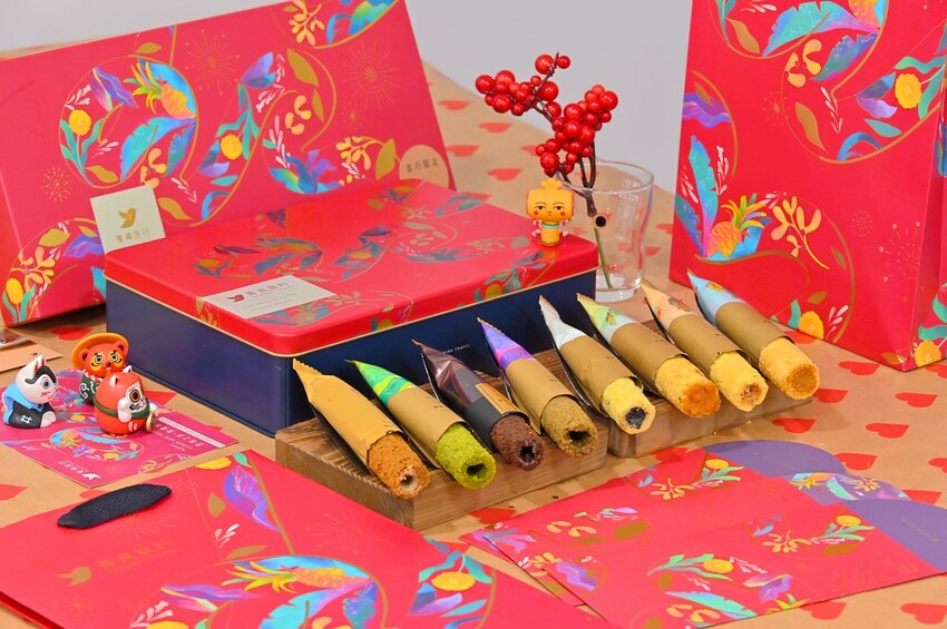 特別為了春節新年設計的喜慶色調,舞動春結象徵2025代表生肖「蛇」充滿著力量與生命力,交織出無限的心意,祝福收到禮盒的人有幸福美好的一年。這個「春舞金燦真巧蛋捲禮盒12入」吃得到4種口味灌餡蛋捲。每種口味三條,都是個別獨立包裝,