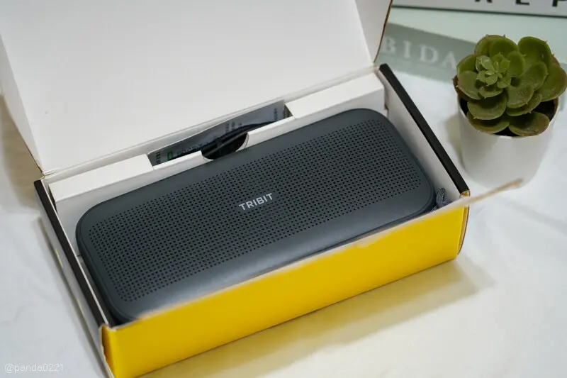 收到產品後,開箱包含了音響、充電線和說明書。Tribit StormBox Flow的大小適中,輕便易攜。它擁有IP67防水等級,適合各種戶外環境,像是擺放在浴室播放音樂或在下雨天使用也沒有問題。不過,仍建議避免直接沖水或在淋浴時使用。