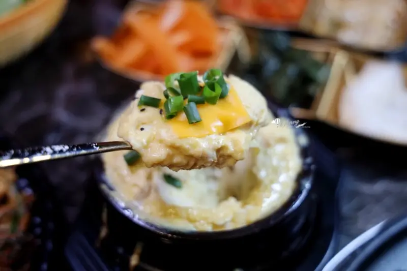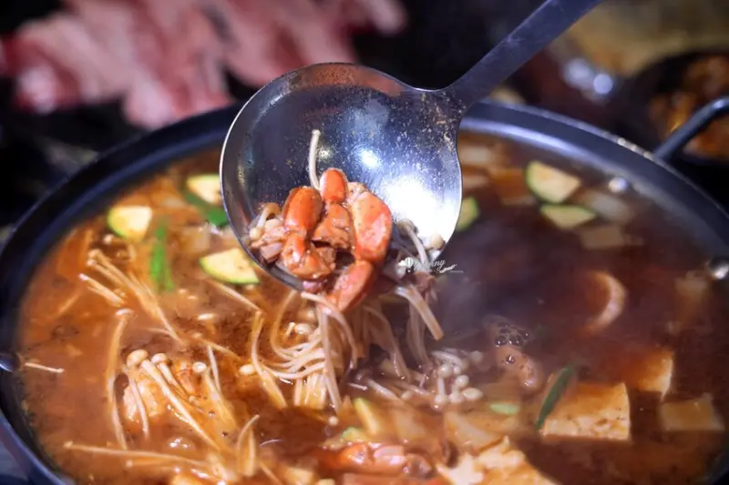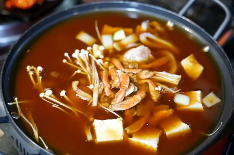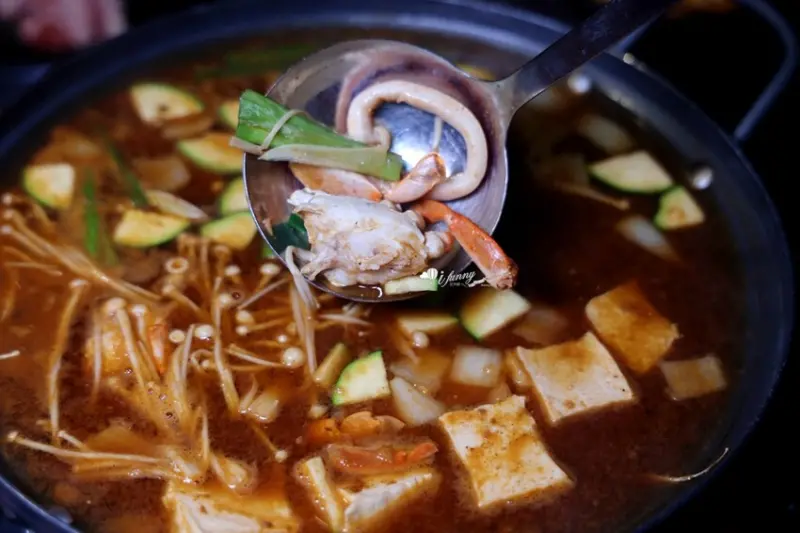 大醬湯是韓國家庭湯品,放了滿滿的食材,有螃蟹、魷魚、洋蔥、櫛瓜、豆腐、金針菇、蔥等,風味濃郁且營養豐富,喝來超溫暖。