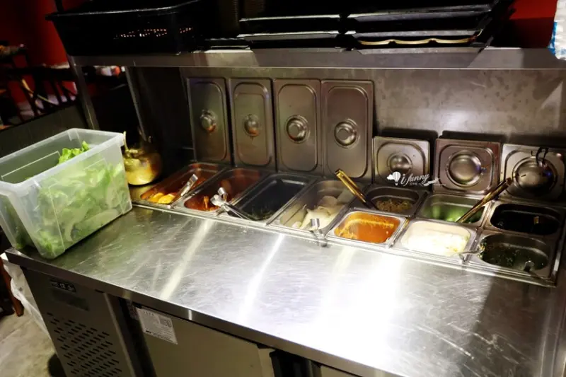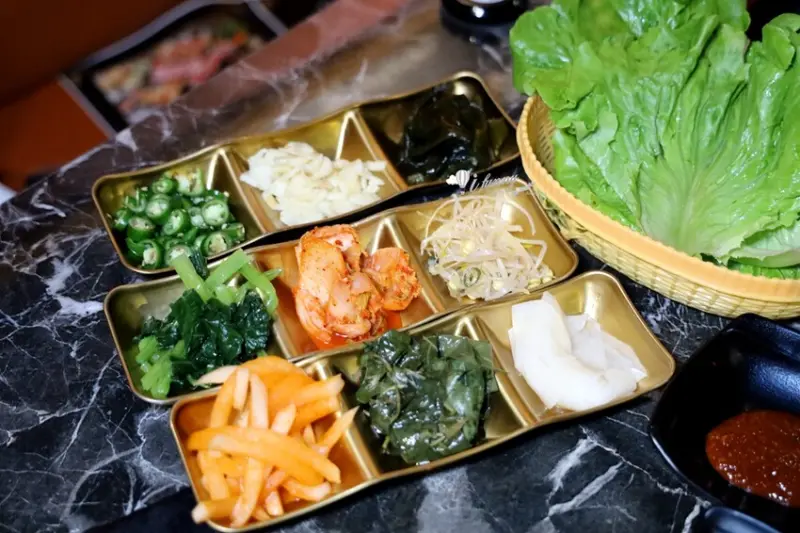 這一區備有六種韓式小菜、包肉生菜、沾醬、蒜片、辣椒等,可以供大家自行無限續加。