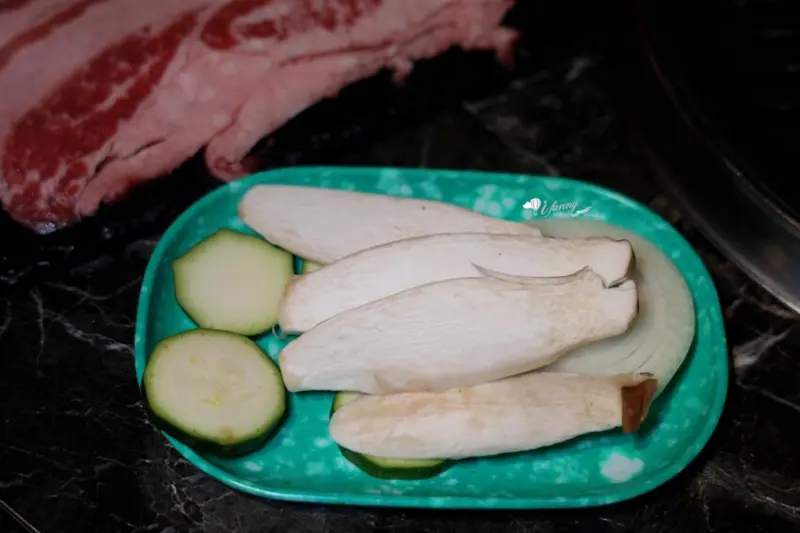 除了烤肉外,也有蔬菜的選項,店家會先上一盤櫛瓜、杏鮑菇及洋蔥,後續我們直接追加了大量的櫛瓜及杏鮑菇,水份很多的蔬菜,就是搭烤肉的最佳選擇。