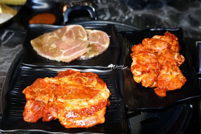 豪華套餐699元吃到飽:升級有六種肉品吃到飽,分別有:五花肉、梅花豬、調味梅花豬、辣味梅花豬、辣味雞腿肉及牛五花。八種飲料(無糖綠茶、可樂、零卡可樂、雪碧、蘋果汁、柳橙汁、檸檬紅茶、柚子茶)無限暢飲,加碼韭菜煎餅、海鮮大醬湯鍋、鐵板奶油玉米、蒸蛋、韓式無骨炸雞及辣炒年糕(提供一次)。等於有十多道料理吃到飽,不單單只是韓式烤肉吃到飽。