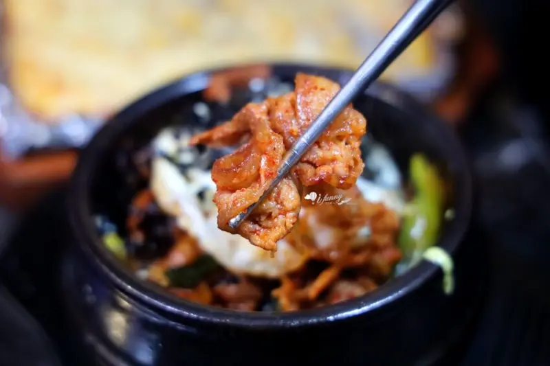 我們把三種主食都點了。這天的拌飯是辣炒豬肉拌飯,加上超厚實的辣炒豬肉。