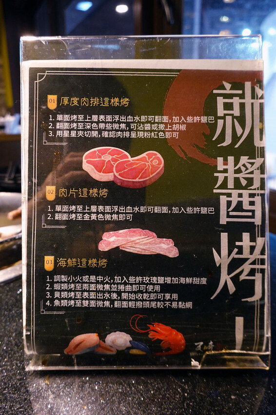 桌上還有教人烤肉的立牌,告訴大家每種食材該怎麼烤,不怕烤太焦或不熟,每個人都能輕鬆成為烤肉達人。