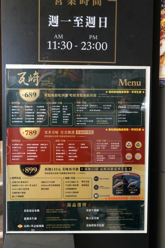 瓦崎燒烤火鍋這家超值的西門吃到飽、公館吃到飽,有三種價位,689、789、899都可自由享用自助吧的食材外,單點的高級肉品和海鮮也可以無限續點,無論花費有限還是想吃得奢華,都有適合的選項。