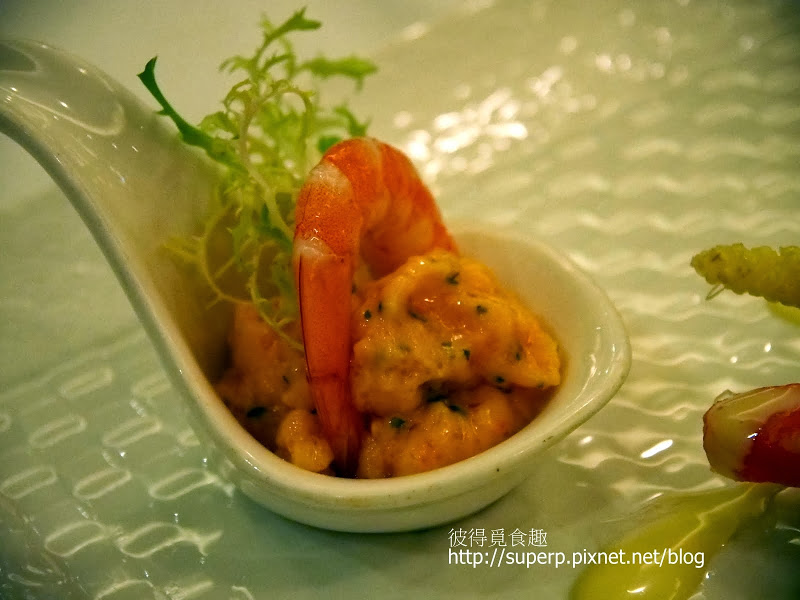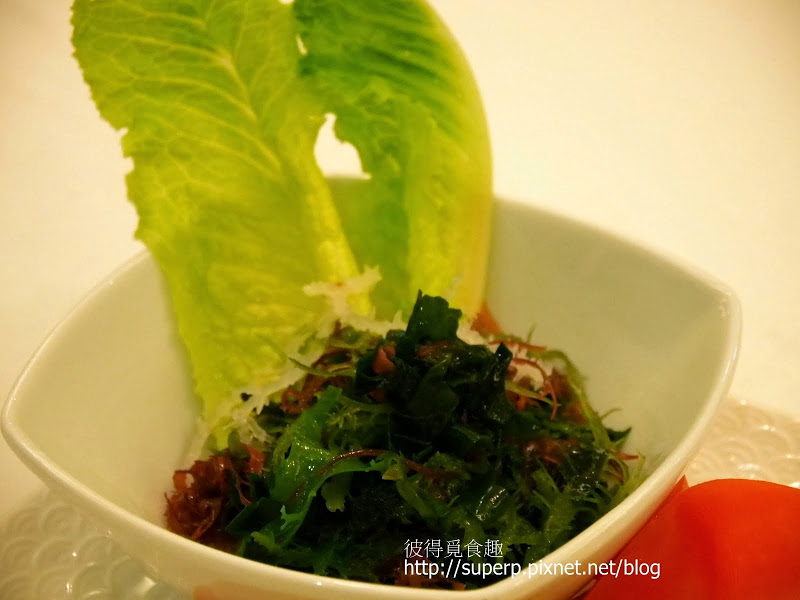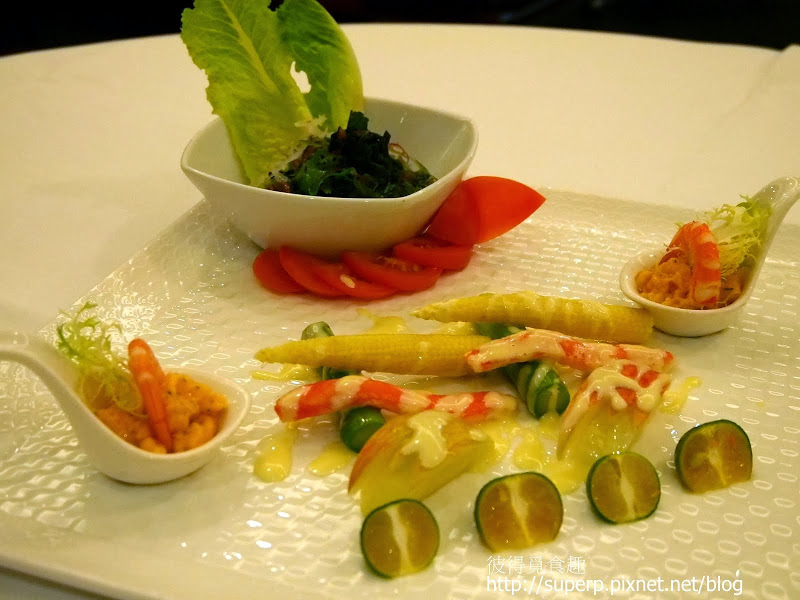 香蒜茶油沙拉松葉蟹(松葉蟹腳和玉米筍以及蘋果搭配甜甜的優格醬,還不賴。蝦仁的部分搭配類似龍蝦沙拉餡的東西,味道有點太重。如果沙拉餡可以減少,蔬菜放多一點會更好。另外,海藻沙拉有搭配苦茶油和其他醬料,非常清爽可口。海藻沙拉的部分是大推!其他的部分是一般。)