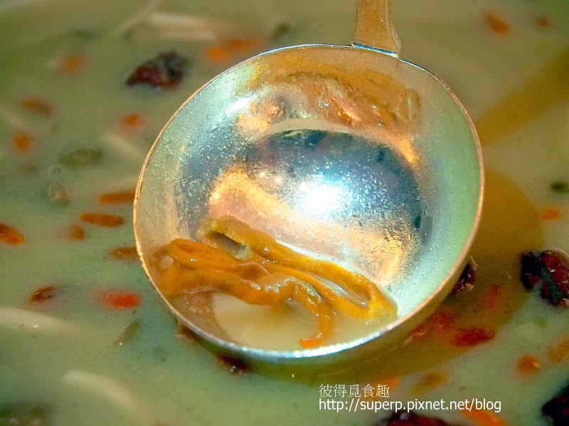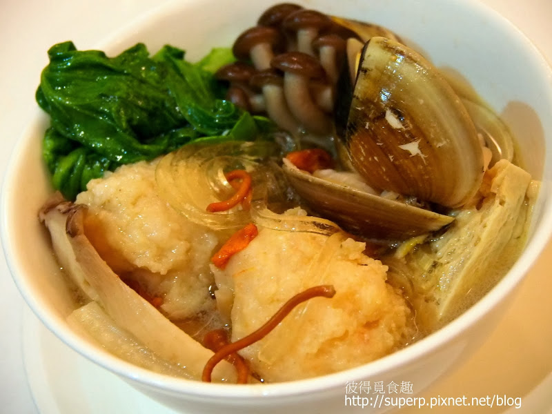 湯鍋很大,跟驥園的砂鍋雞湯差不多。裡面的湯據說是由豬骨跟老鴨熬煮8小時而成的。裡面還有綜合菇類,以及最重要的蟲草,也就是據說極為滋補的冬蟲夏草。我是第一次喝冬蟲夏草熬煮的湯,無法跟以往的經驗做比較。反正,這湯頭濃郁鮮美,層次豐富,非常的好喝。