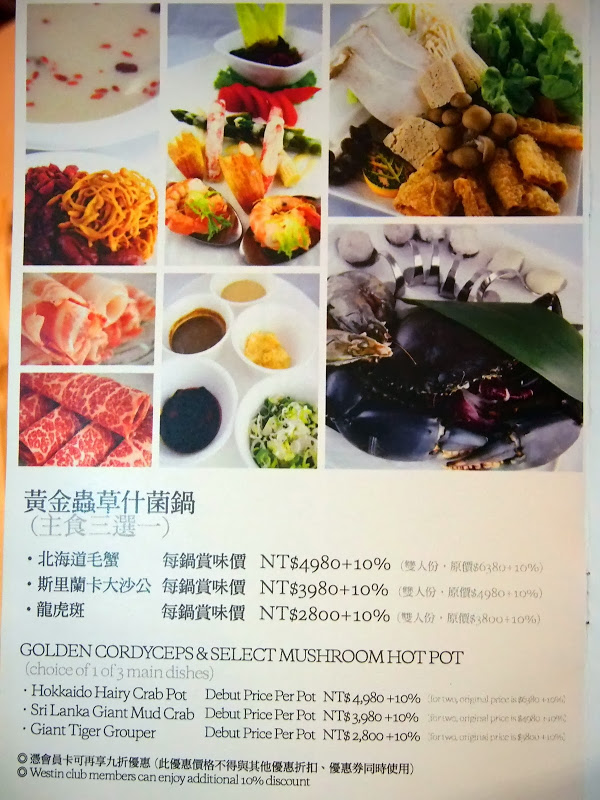 這是黃金蟲草什菌鍋的雙人菜單。原價是$4,950+10%,現在是$3,980 + 10%。有三種主食可選,我吃的是斯里蘭卡大沙公這主餐。裡面還會附開胃飲品,前菜,肉類,綜合菜盤,苦茶油拌麵線,甜品和水果。