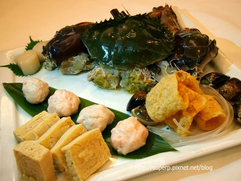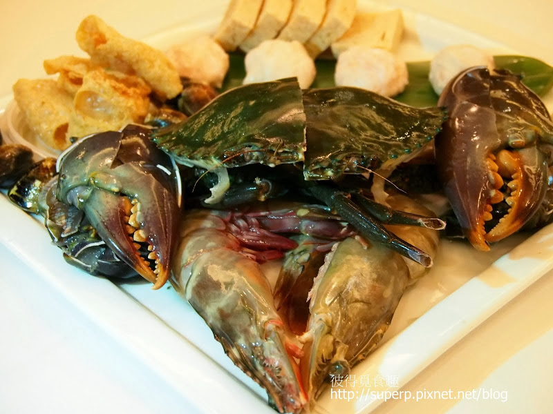 海鮮鍋料拼盤(斯里蘭卡大沙公是現殺的,很生猛。除了沙公,最搶眼的是兩隻碩大的海草蝦。待會兒我會有比例尺。除此之外,還有草蝦丸,花枝丸,以及干貝…等等的料)