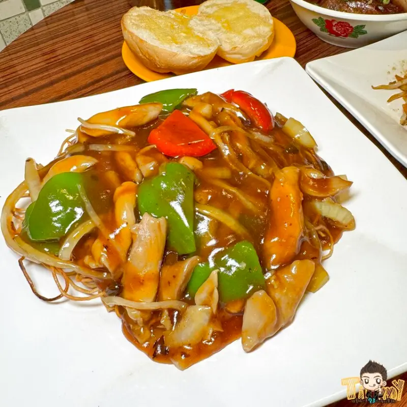 豉椒雞肉廣炒麵(210元),麵條選用竹笙麵,炸過後再淋上由青椒、豆豉、雞肉等食材燴煮的芡料