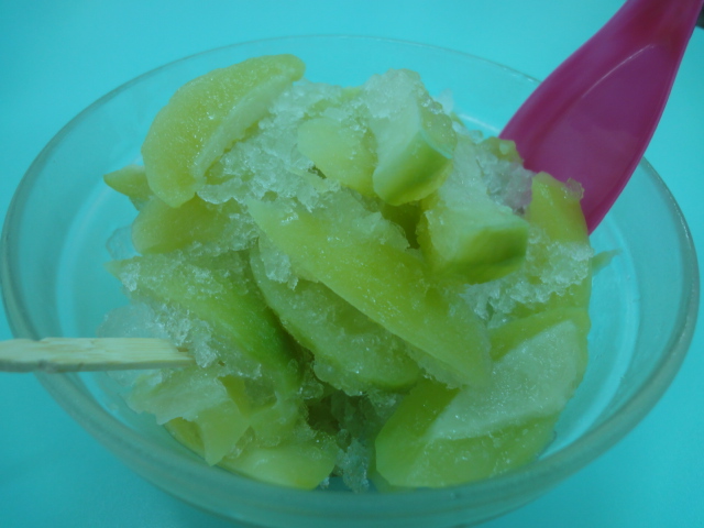 酸甘甜的情人果 搭配滿滿的碎冰 一碗賣45元 不管你是用湯匙挖 或是拿牙籤戳 都十分清涼消暑!