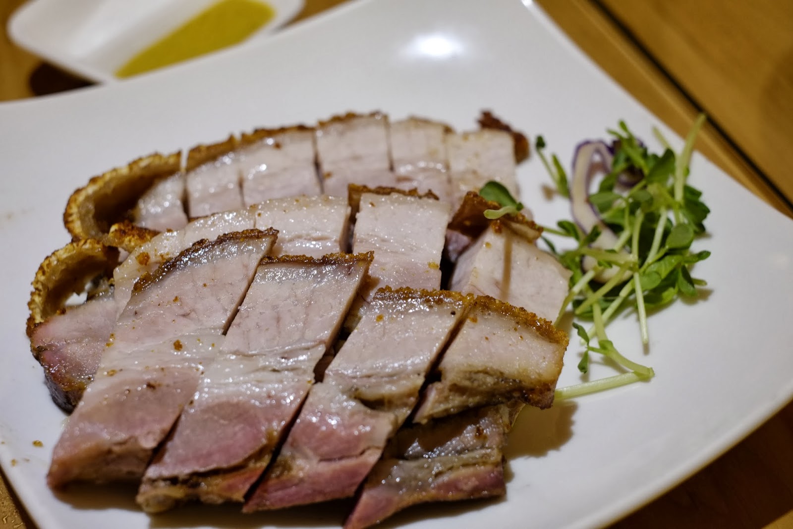 燒腩,我不知道這是怎麼處理的,有附上砂糖跟芥末可以沾。最上面的皮是酥酥脆脆,讓人對皮的油膩感少了很多,吃起來皮脆肉嫩,滋味迷人,本身帶點鹹味,很下飯,加上豬肉份量夠大,沾上砂糖又是不一樣口感!芥末則帶點嗆辣味中和那鹹味,蠻特別的。