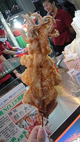就是高雄在地人最愛逛的夜市,「沖繩酥炸大魷魚」這間小攤,不但需要