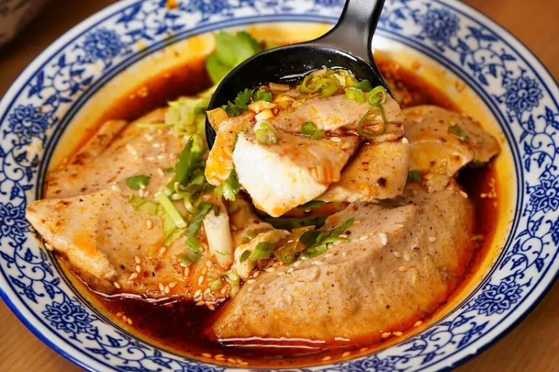 乍看整盤紅通通一片,好像辣度非常高,不過實際上吃起來卻比微辣的「經典紅油冒菜」來得溫和,辣口又不辣喉,魚編即使不配飯也沒問題。