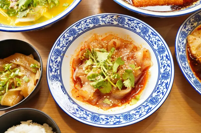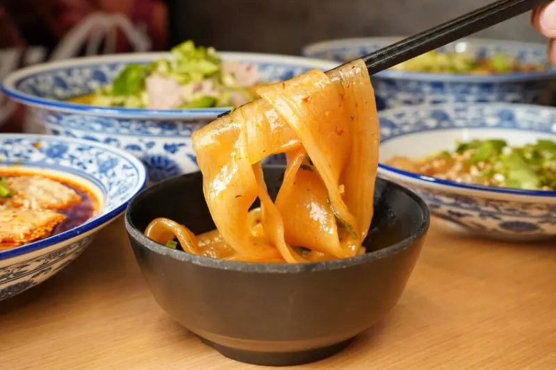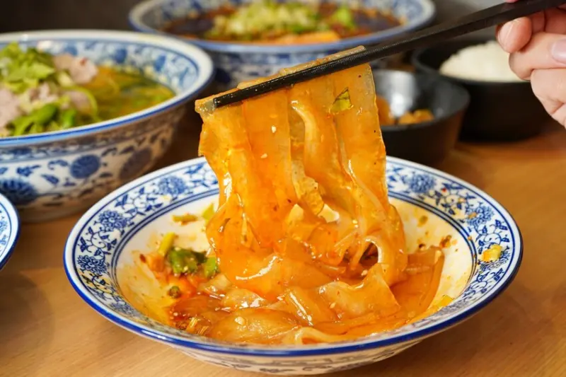 紅油迷人的香氣充份地巴附著手工寬粉,辣香入味卻不死鹹,讓人忍不住一口接著一口。