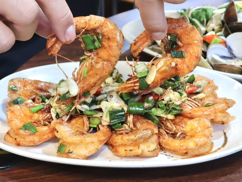 ▼除了薑母鴨鍋外,這裡竟然還有賣熱炒耶!!菜單品項很豐富,超多下酒菜真的是朋友聚餐好去處~椒鹽蝦表面裹上白胡椒,鹹香夠味非常涮嘴。搭配大量青蔥蒜頭,真的就是最台味的下酒菜啊!