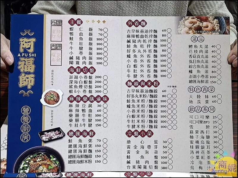 阿福師菜單餐點種類很多,麵、飯、米粉、麵線通通有,還有各種切盤、藥膳滷味、海鮮、飲料…價位大多是百元上下,從市場超人氣小攤到現在兩家分店,餐點用料實在。