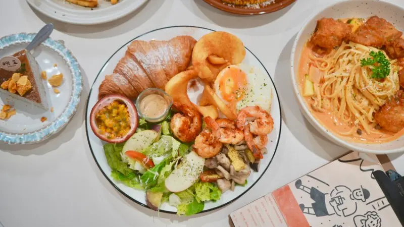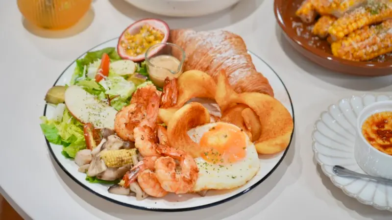 假日總愛睡晚點,來嶼里吃早午餐就點蝦蝦可頌早安盤!擺盤超繽紛,大份量的日式可頌、太陽蛋、薯塊、奶油蝦、蕃茄、蘋果、百香果、炒菇和沙拉,健康又均衡!
