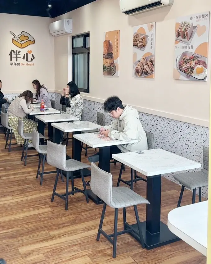除了伴心早餐新莊復興店之外,在板橋也有伴心早餐板橋文聖店,全新的店裝潢就像是有規模的咖啡廳,但賣的是平價的早餐、早午餐,而且免收服務費,難怪生意很好,當天平日去用餐,也一直都是客滿狀態,外帶客人也不少,翻桌率很快,稍微等一下就有座位。