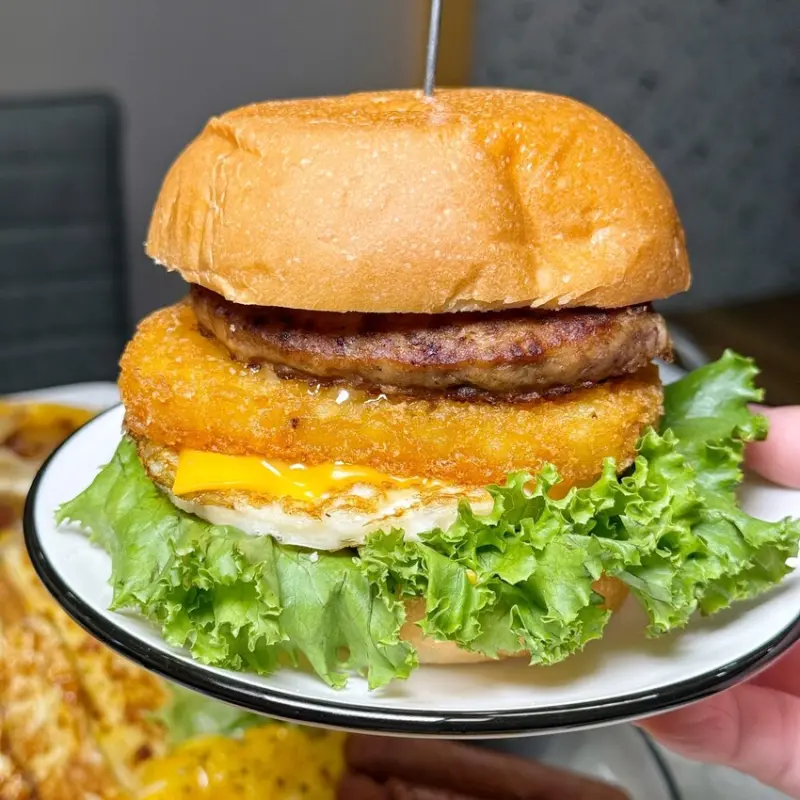 「招牌秘醬牛漢堡」用料超實在!有蛋、番茄、起司、生菜,還有酥脆的薯餅及多汁漢堡排,搭配自帶奶香的漢堡麵包,咬下去滿滿幸福感。尤其薯餅和漢堡的組合,口感真的更豐富層次感!