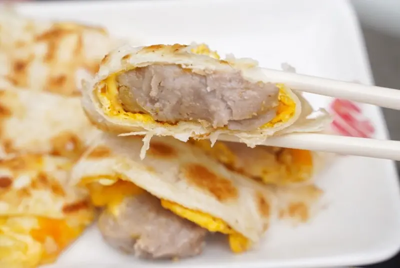 「芋見乳酪千層蛋餅」也是推薦必點!這芋泥厚度絕對能滿足芋泥控,加上牽絲起司,鹹鹹甜甜的滋味以及酥脆的蛋餅皮,真的很好吃!