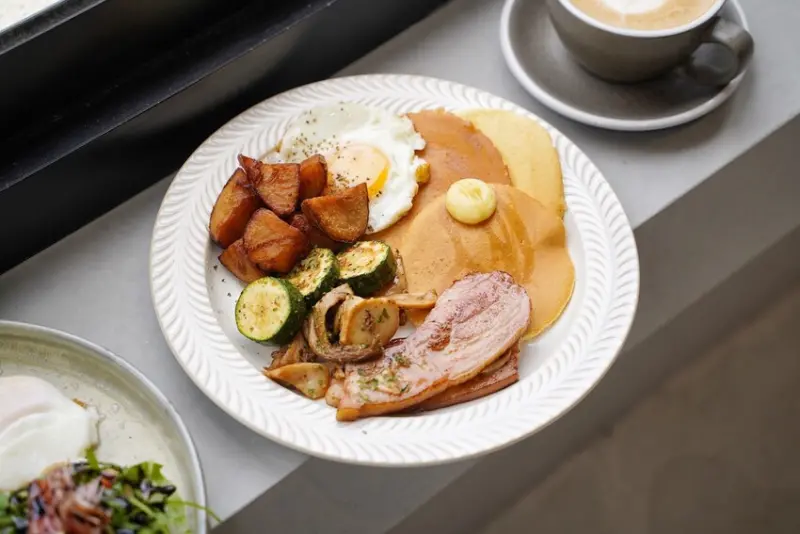 「誠意滿滿豐盛澳式鬆餅」包含美式鬆餅、厚切大培根、太陽蛋、現炒蘑菇、烤櫛瓜、現炸薯塊,超大一盤非常豐盛,每一個食材的很用心料理,尤其厚切大培根真的又香又彈牙,真的很好吃。