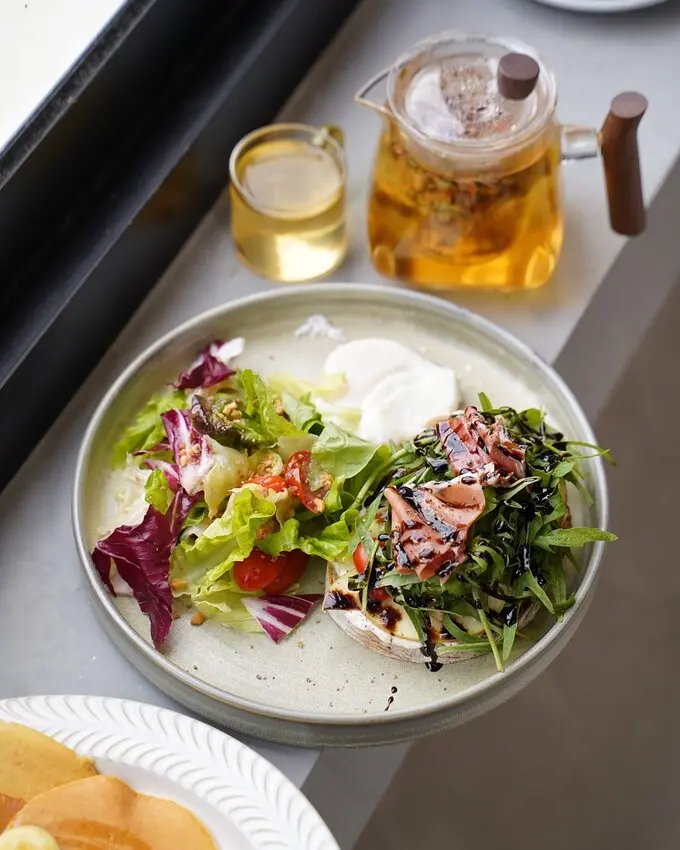 每個套餐有附紅茶或咖啡,也可以加價換購其他飲料,推薦點這杯熱飲「花園派對」,使用9食材沖泡的有機花果茶,香氣非常有層次,喝不夠還可以回沖,這裡熱拿鐵系列也有美美的拉花,這杯熱的「桂花拿鐵」帶有香甜桂花香,非常順口好喝。