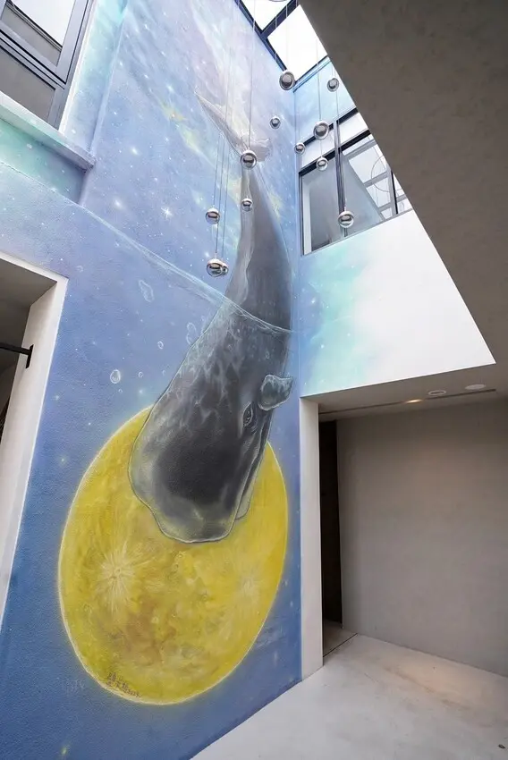 一走進門,映入眼簾的是挑高天井下的鯨魚壁畫,抬頭仰望格外震撼。右側是咖啡廳空間,也是明天早午餐用餐的地方,左側則是民宿的接待櫃台以及住客休息室。