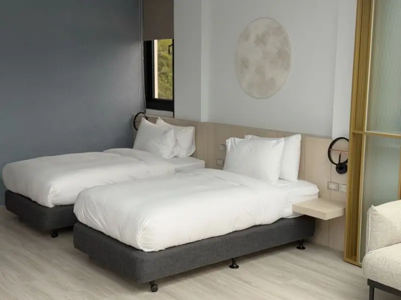 「碩月四人房」有兩張單人床以及一張雙人床,很適合家庭或者情侶帶朋友一起來住宿。