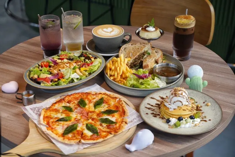 咖啡廳採墨綠、木質與清水模設計,散發出輕奢又文青的氛圍 。