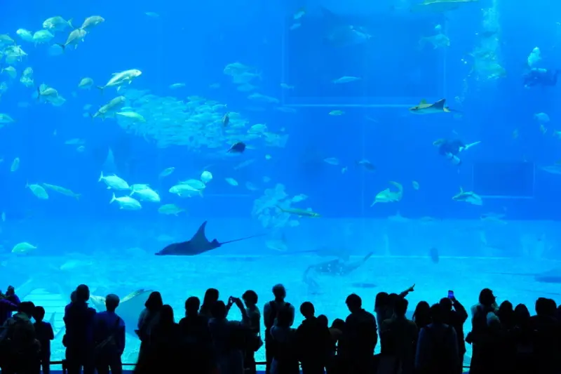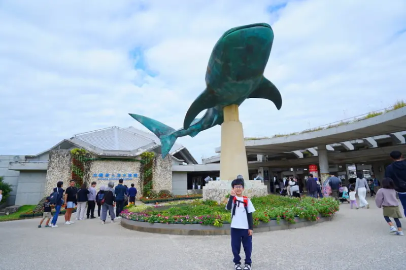 隔天我們來到了沖繩最大的水族館—沖繩美麗海水族館!這裡真的超有名,裡面有各種超美的海洋生物,特別適合全家一起來參觀。不過,因為碰上日本的新年假期,所以水族館裡人超多,幾乎是擠得滿滿的!