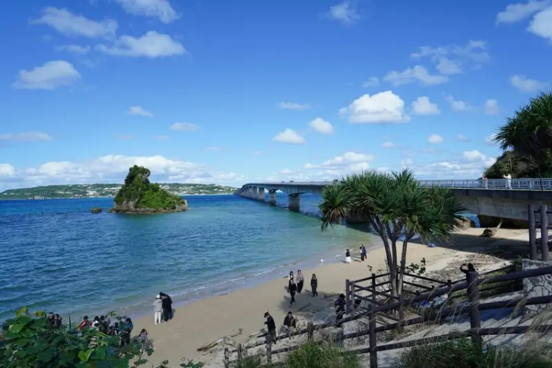今晚我們要住北部的飯店,所以一路開車往北走,這次安排了去看古宇利大橋!要看這個大橋,其實有兩個地方可以去,一個是古宇利大橋南端觀景台,另一個是古宇利海灘。不過我覺得南端觀景台最美,站在那邊可以把整座橋和海景都盡收眼底,超級壯觀的!