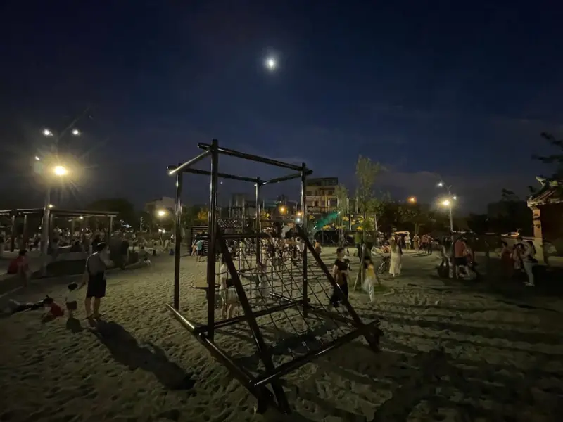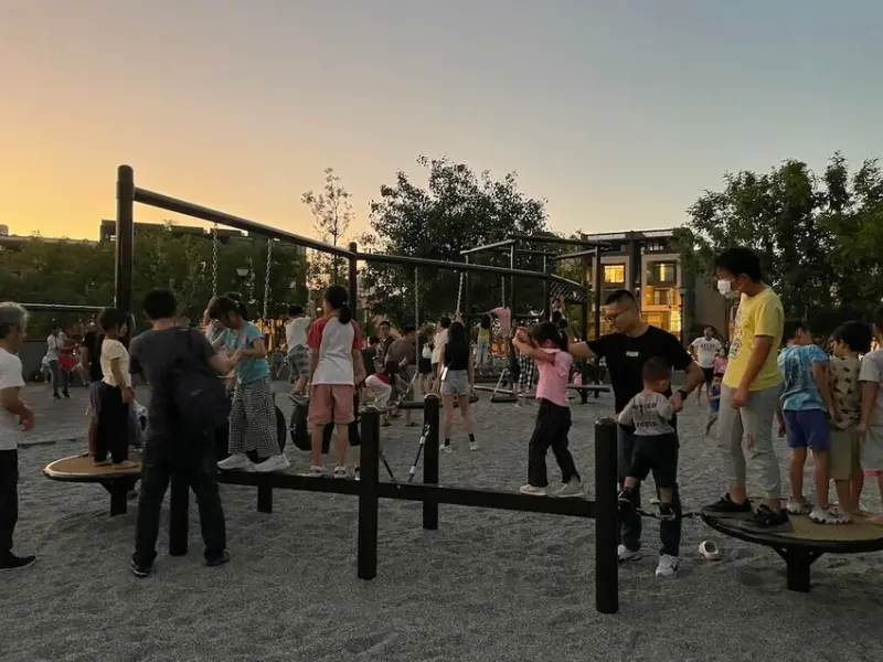 小朋友玩到天黑了,還不想回家,還在排500障礙闖關。