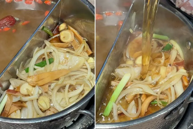 ▼肉之間麻油石頭鍋,先將大量洋蔥、蒜頭、老薑、魷魚,用麻油爆炒出香氣,再加入鍋底高湯,超級香! 光用聞的就先開胃。喝起來溫潤滋補但又不會覺得上火。涮肉品也很適合。