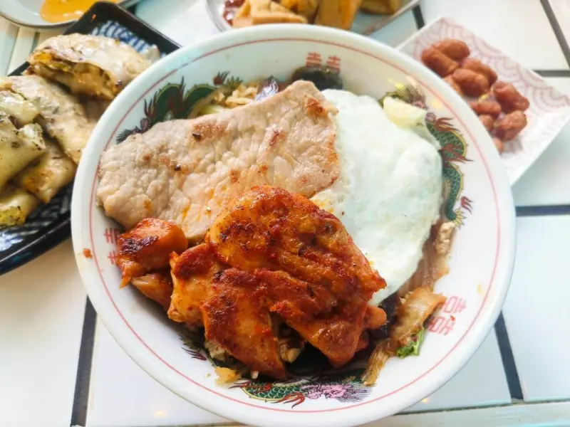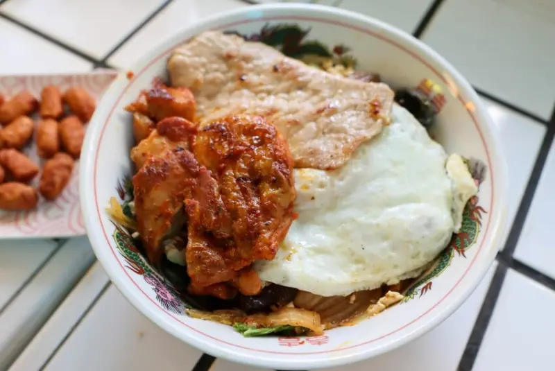 滿滿一大碗的炒泡麵,一塊豬里肌肉、一塊雞腿排、半熟蛋、炒皮蛋臭豆腐 組合起來到底會碰撞出怎樣的火花?