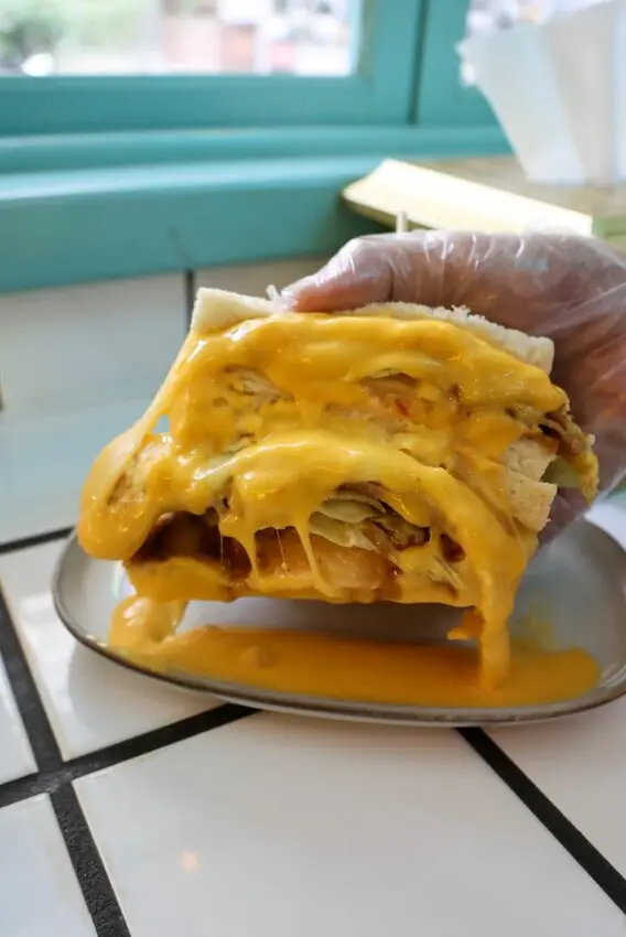 軟嫩的牛五花、起司、洋蔥,蛋餅本身吃起來就已經有調味過,鹹淡對我們來說剛剛好,所以我就沒有額外再加醬料了