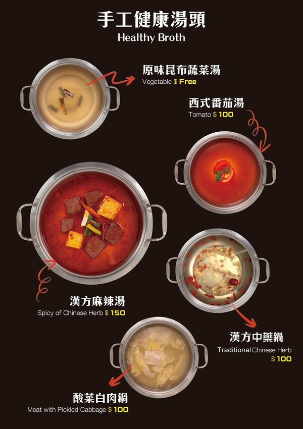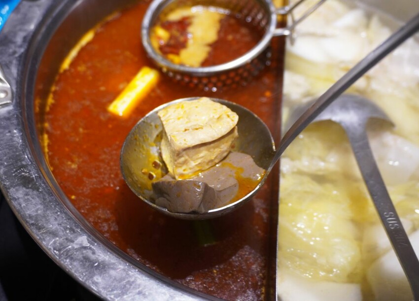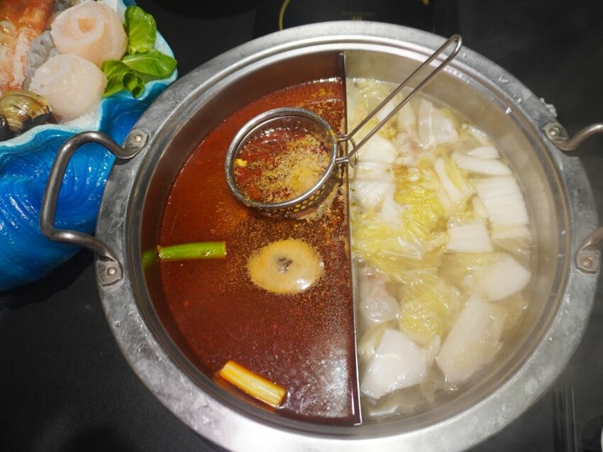 湯頭分別是漢方麻辣湯底跟酸菜白肉鍋,以整隻雞加入昆布進行手工熬煮,最後再放入辣椒等藥材,喝一口麻辣湯,滋味香麻,辣度直衝腦門,過癮。