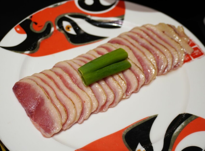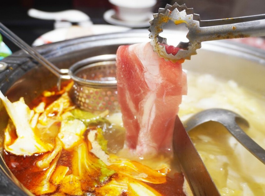 袁彬跟友人的肉盤分別選擇櫻桃燒鴨胸跟至尊肩胛羊,用夾子將鴨胸肉片放進麻辣鍋湯底涮個幾下,等鴨胸吸附湯汁,送入口中,不沾醬也很好吃。