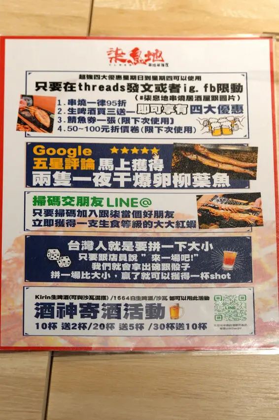 店裡還有一些超划算的優惠,打卡評論都送好禮,社群發文就能享四大優惠,像是串燒95折、生啤酒買3送1,還送招待券和折價券,而且招待券和折價券是旗下所有分店都能通用的喔!