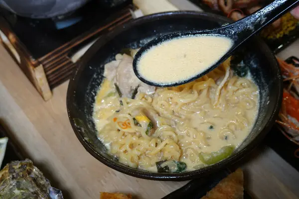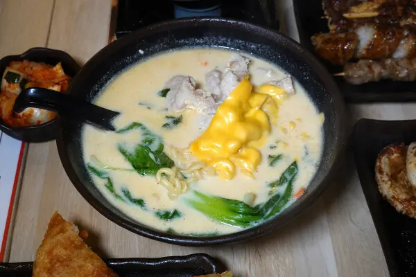 柒息地雖然是串燒居酒屋,但他們的拉麵也真的不容小覷!裡面不僅有滿滿的肉片和青菜,料超足的,還有那片金黃的起司,放上去後整碗麵看起來超誘人,光是想像那起司融化的畫面就讓人垂涎三尺啊!